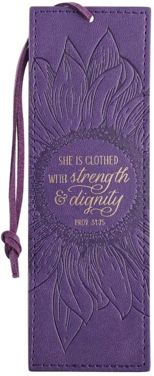 The Strength and Dignity Purple Sunflower Faux Leather Bookmark sings the praises of a godly woman and pairs it with a fun sunflower design. The woman who can face the future with strength and dignity is a person who has her faith deeply rooted in the truth of Scripture.