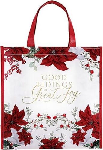 FESTIVE DESIGN Features bright poinsettias and Good Tidings sentiment with holiday flair
