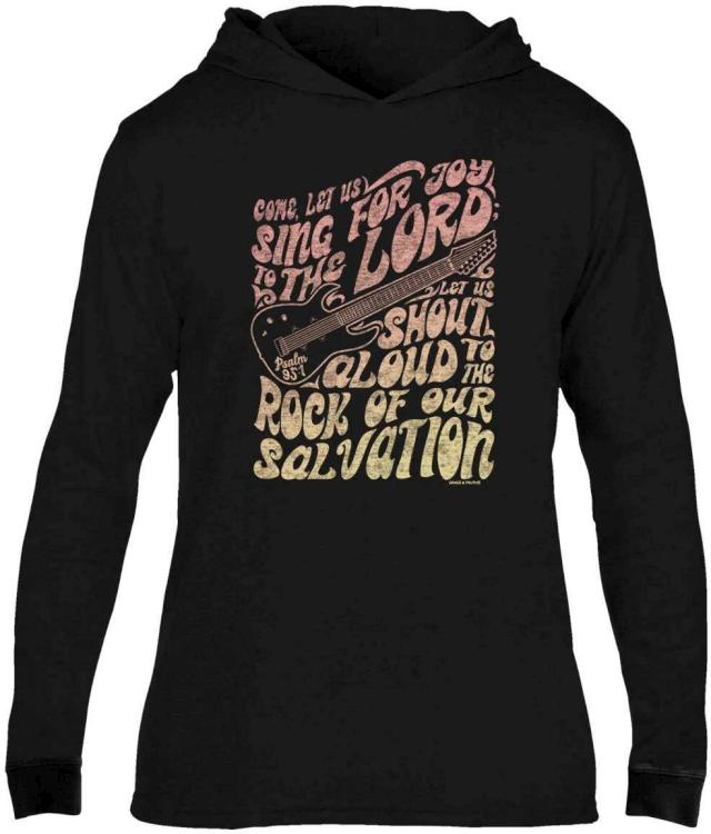 Rock on in Jesus name in this cool Sing For Joy Hooded T-Shirt by grace & truth in Black. This Hooded T-shirt is perfect for layering and will remind you of your favorite concert Tee. You ll want to wear it again and again!