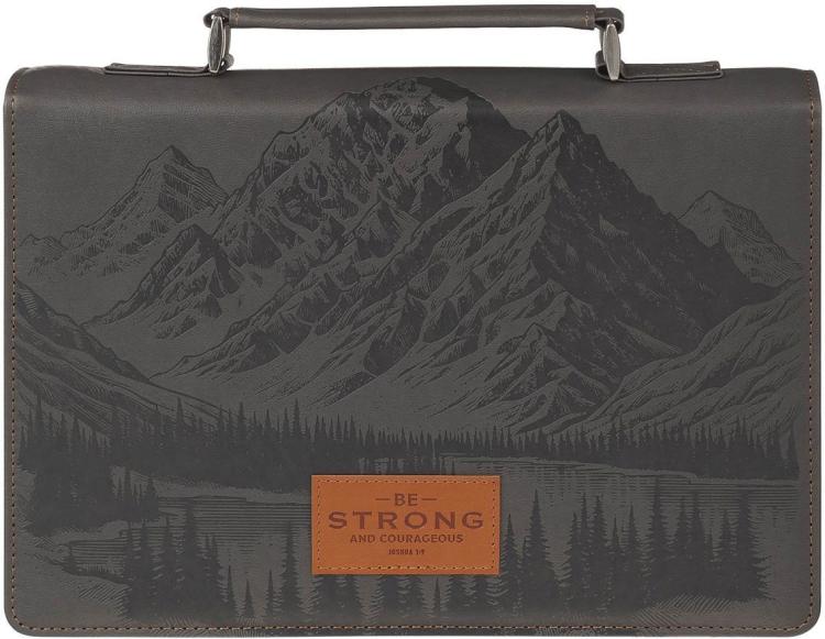 The Be Strong and Courageous Charcoal Gray Faux Leather Classic Bible Cover is made for adventurous men who face life with faith and courage.